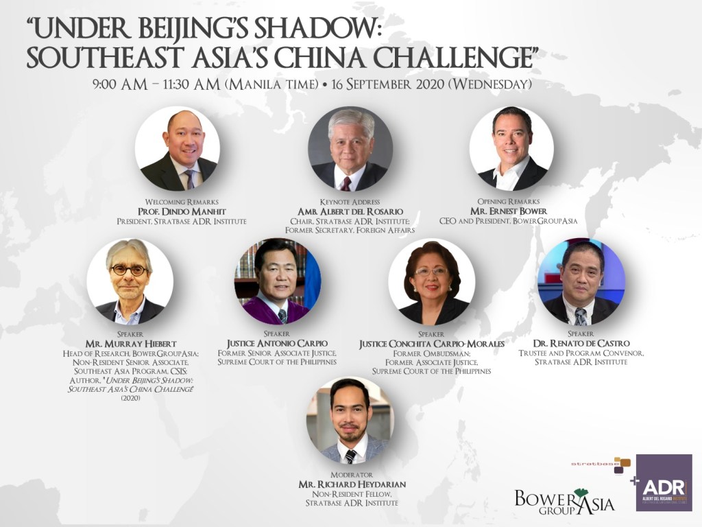 The Stratbase Albert del Rosario Institute has proudly partnered with BowerGroupAsia’s Head of Research and top Asia expert Murray Hiebert as he delves deeper on his most recent book, “Under Beijing’s Shadow: Southeast Asia’s China Challenge” which provides a snapshot of ten countries in Southeast Asia by exploring the complexity of their diverse experiences with China and how it impacts their perceptions of Beijing’s actions and its long-term political, economic, military, and “soft power” goals in the region.