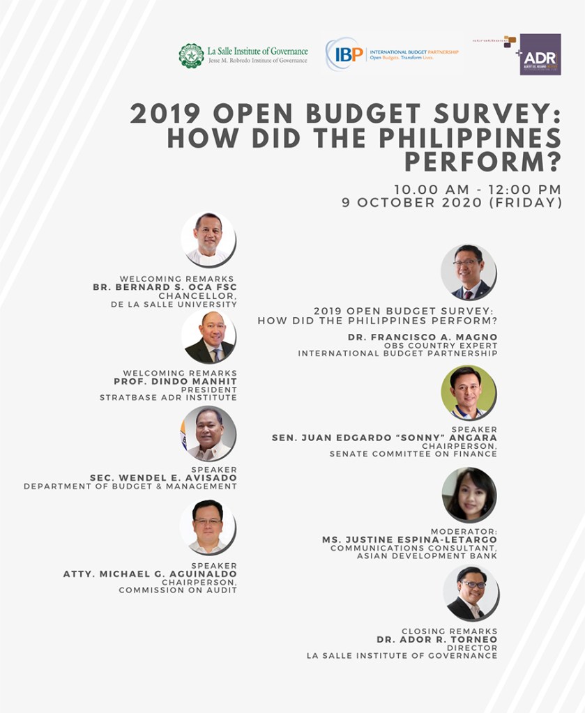 In this regard, De La Salle University – Institute of Governance, in partnership with the International Budget Partnership and Stratbase ADR Institute, organized a presentation of the “The 2019 Open Budget Survey: How did the Philippines Perform?”, held on 9 October 2020, Friday, from 10:00 AM – 12:00 PM.