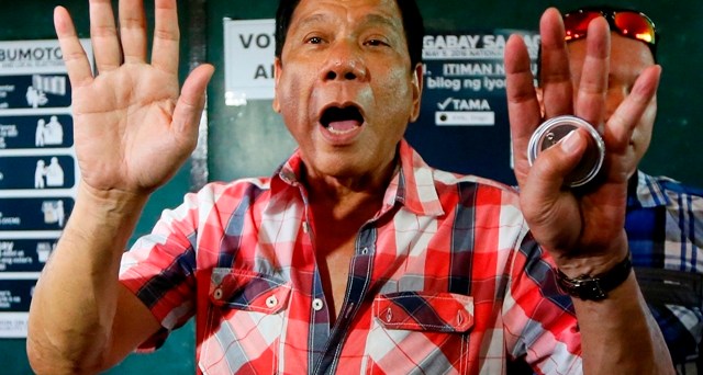 FILE – In this Monday, May 9, 2016 file photo, front-running presidential candidate Mayor Rodrigo Duterte gestures at photographers to move back prior to voting in a polling precinct at Daniel R. Aguinaldo National High School at Matina district, his hometown in Davao city in southern Philippines. The U.S. has upset China by sending on… Read More