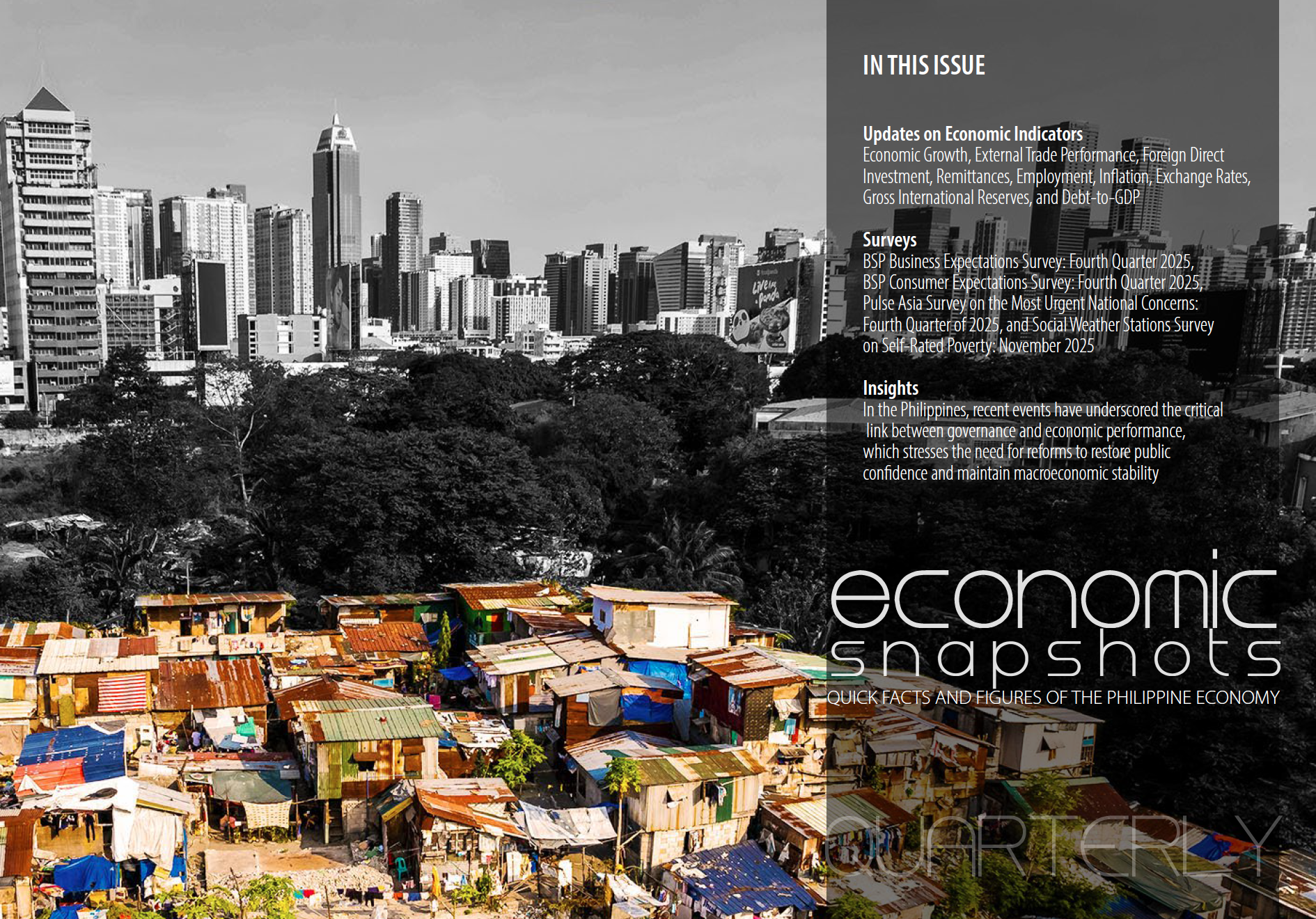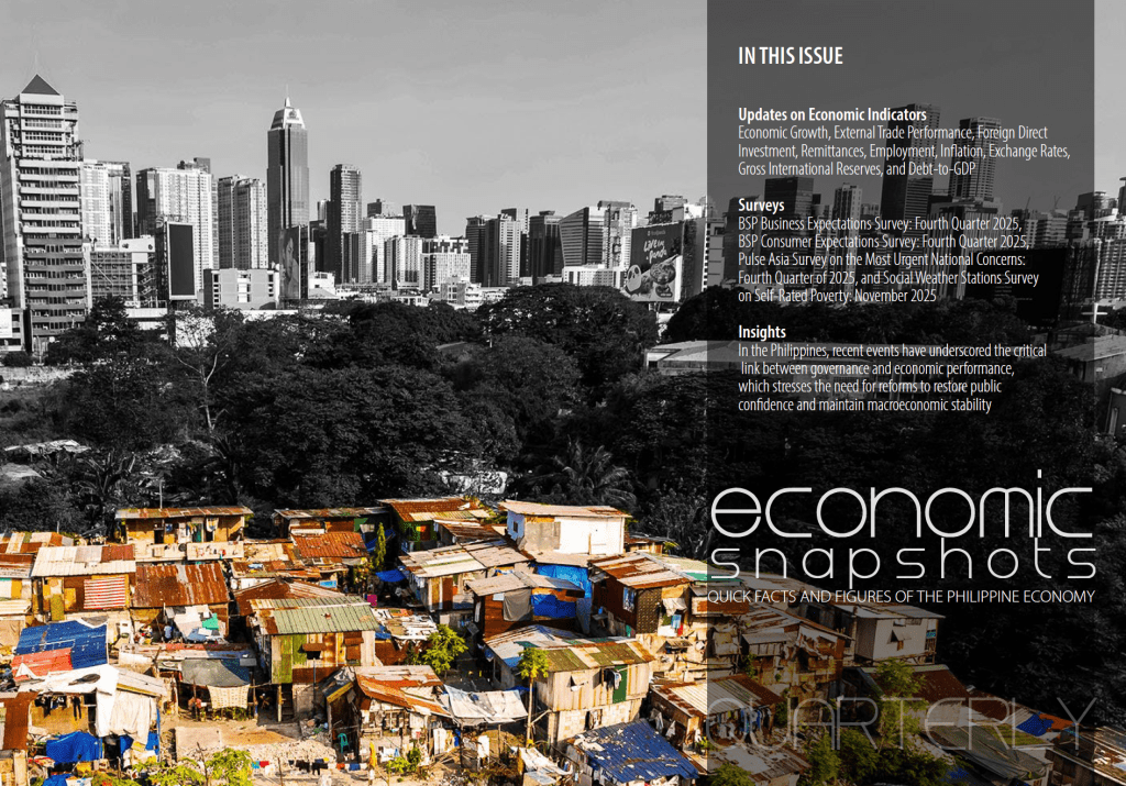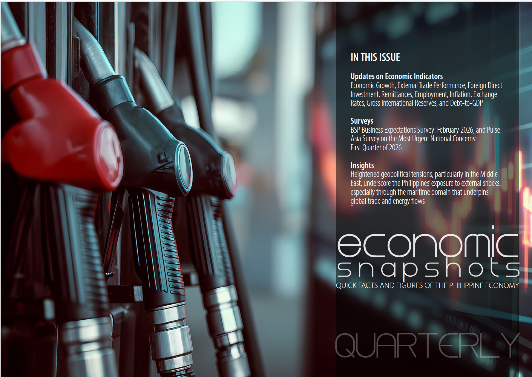 Stratbase Institute provides regular updates of the economic and political developments in the country on a quarterly basis. Politika and Economic Snapshots are aimed to provide a macro description of the fundamental indicators of economic and political trends in the Philippines.
